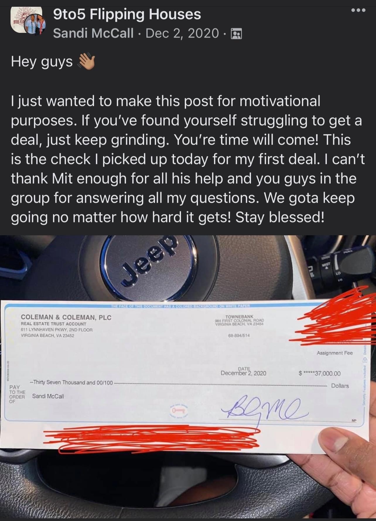Sandi McCall from Virginia Beach Closes her First Deal for $37,000!